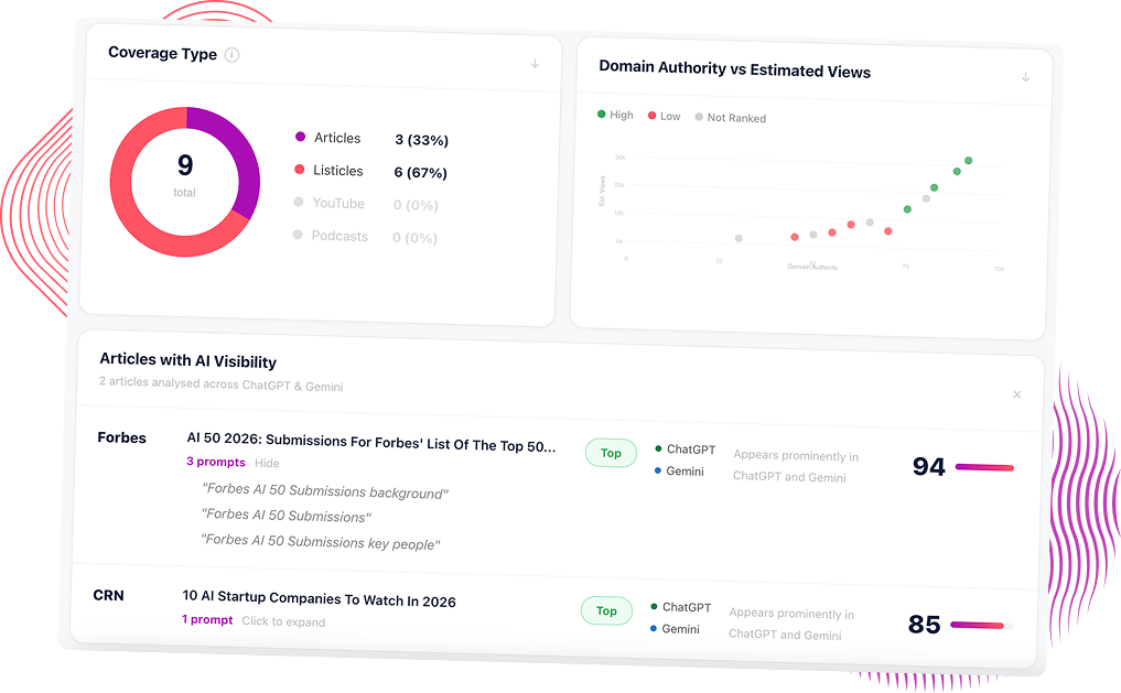 Every placement you land is measured against two questions: Where was the story published? Is it influencing how AI understands your client's brand? We combine traditional coverage metrics (including Domain Authority and Estimated Views) with LLM visibility scoring, in one report, prepared in minutes. All designed from the ground up for PR professionals, not data scientists or growth hackers.