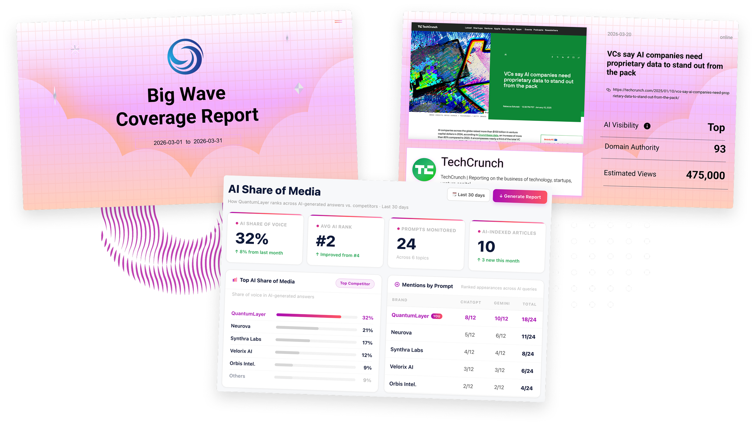 Impactful, customizable reports. LLM visibility that shows exactly where your clients rank in AI and how your earned media made that happen.